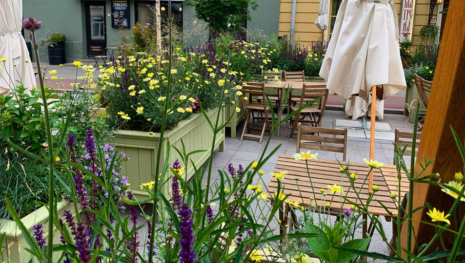 Поскольку кафе расположены рядом друг с другом, мы связываем их определенными элементами дизайна, что делает проект особенно интересным и увлекательным. Основной проблемой является то, что веранды находятся на открытой площадке в центре города, где в жаркое время года очень солнечно. Однако это не единственная сложность. Высокая проходимость клиентов на открытых верандах требует от нас особого внимания к безопасности. Посетители могут быть разными: с детьми и без, с аллергиями и без.