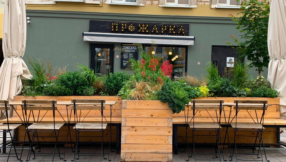Проектирование и реализация веранд для кафе в городе Серпухов. Красочное оформление территории с ранней весны до поздней осени.