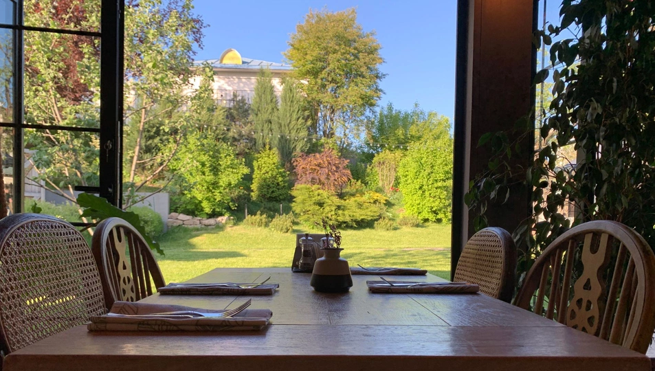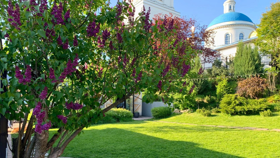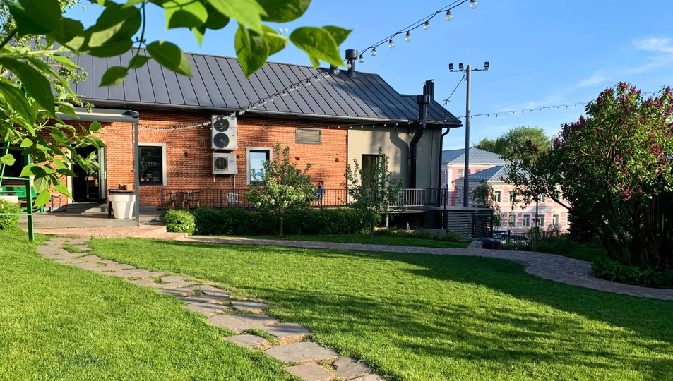 Проектирование и реализации сада для ресторана KitchenMarket. Ресторан расположен в центре города Серпухов на территории, прилегающей к храму. Храм стоит на холме, и из внутреннего двора ресторана открывается великолепный вид на него.