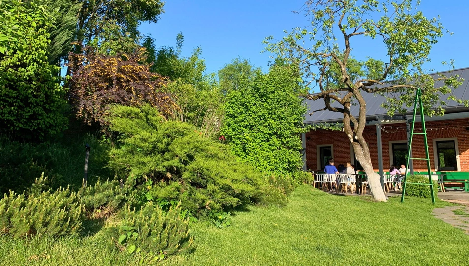 В EL’DESIGN обратился ресторатор из Серпухова, владелец крупного ресторана домашней кухни KitchenMarket. За две недели до открытия он попросил нас создать максимально природный сад, вписанный в окружающее пространство.