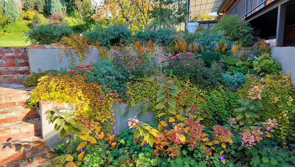 При создании сада мы стремились сохранить его структурность и декоративность до середины октября, что стало основой для подбора растений.