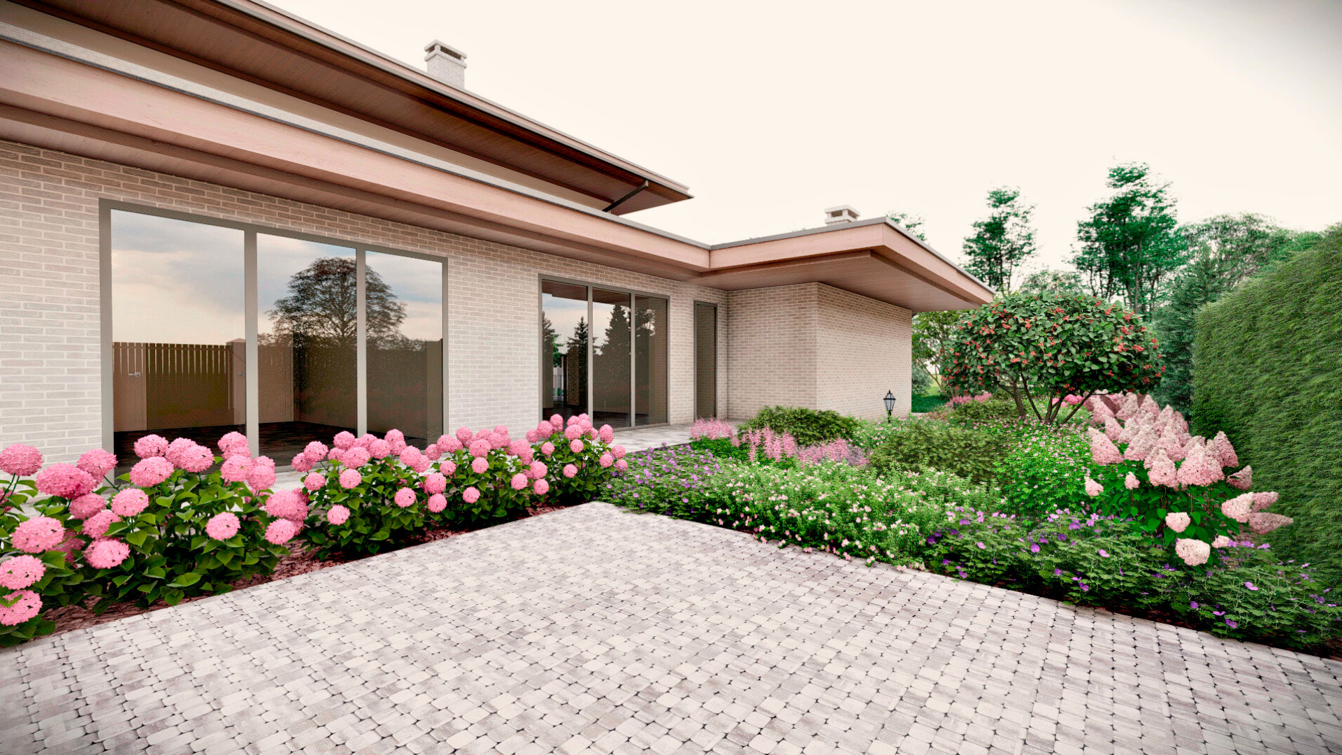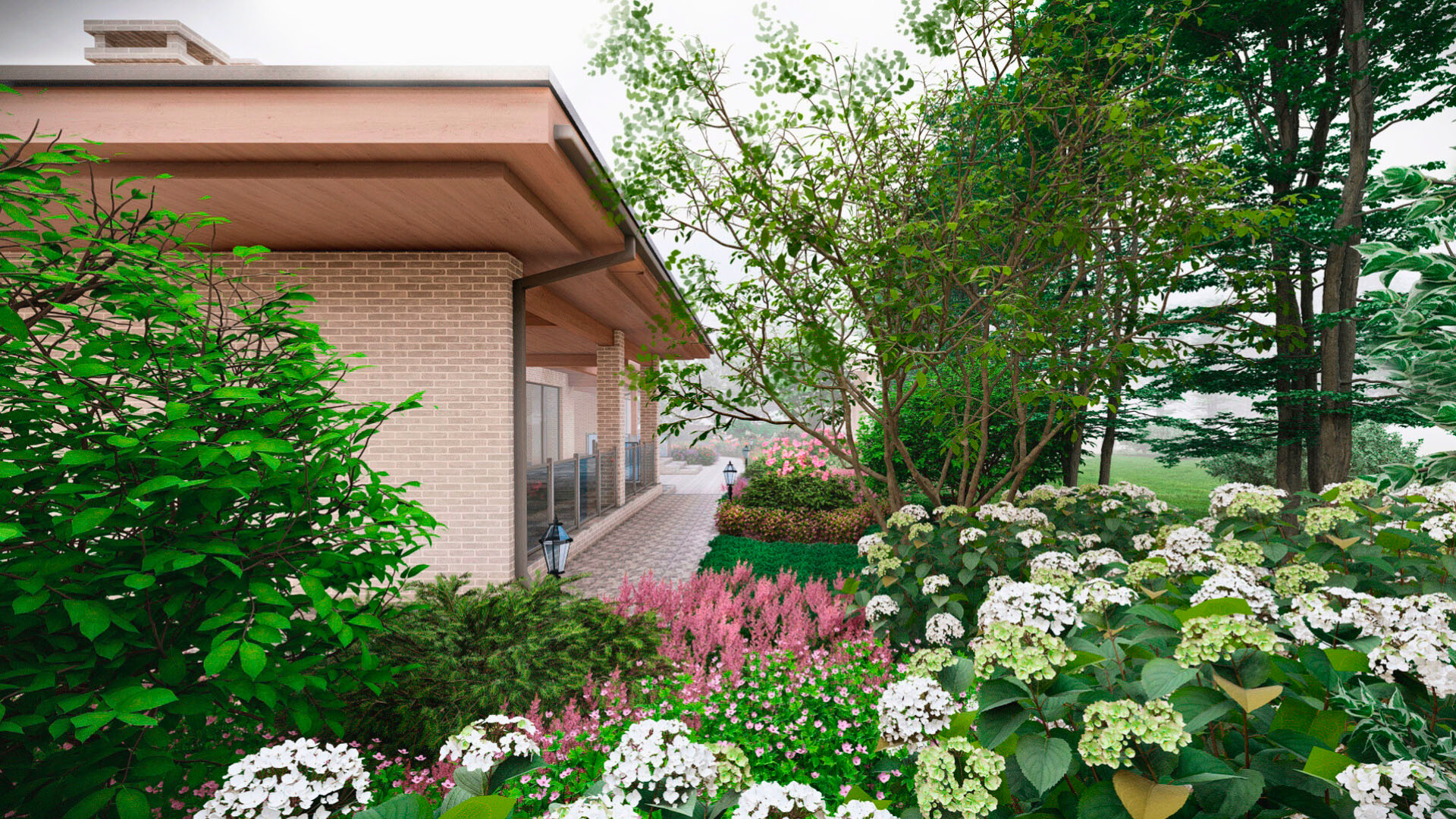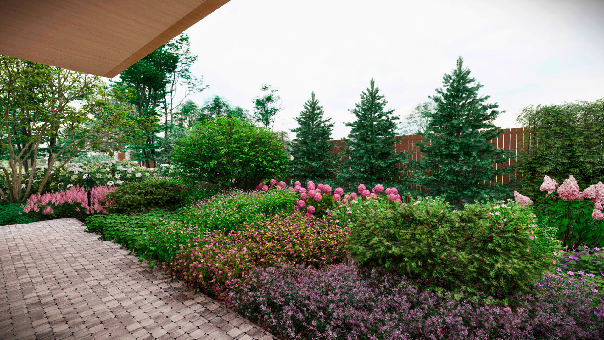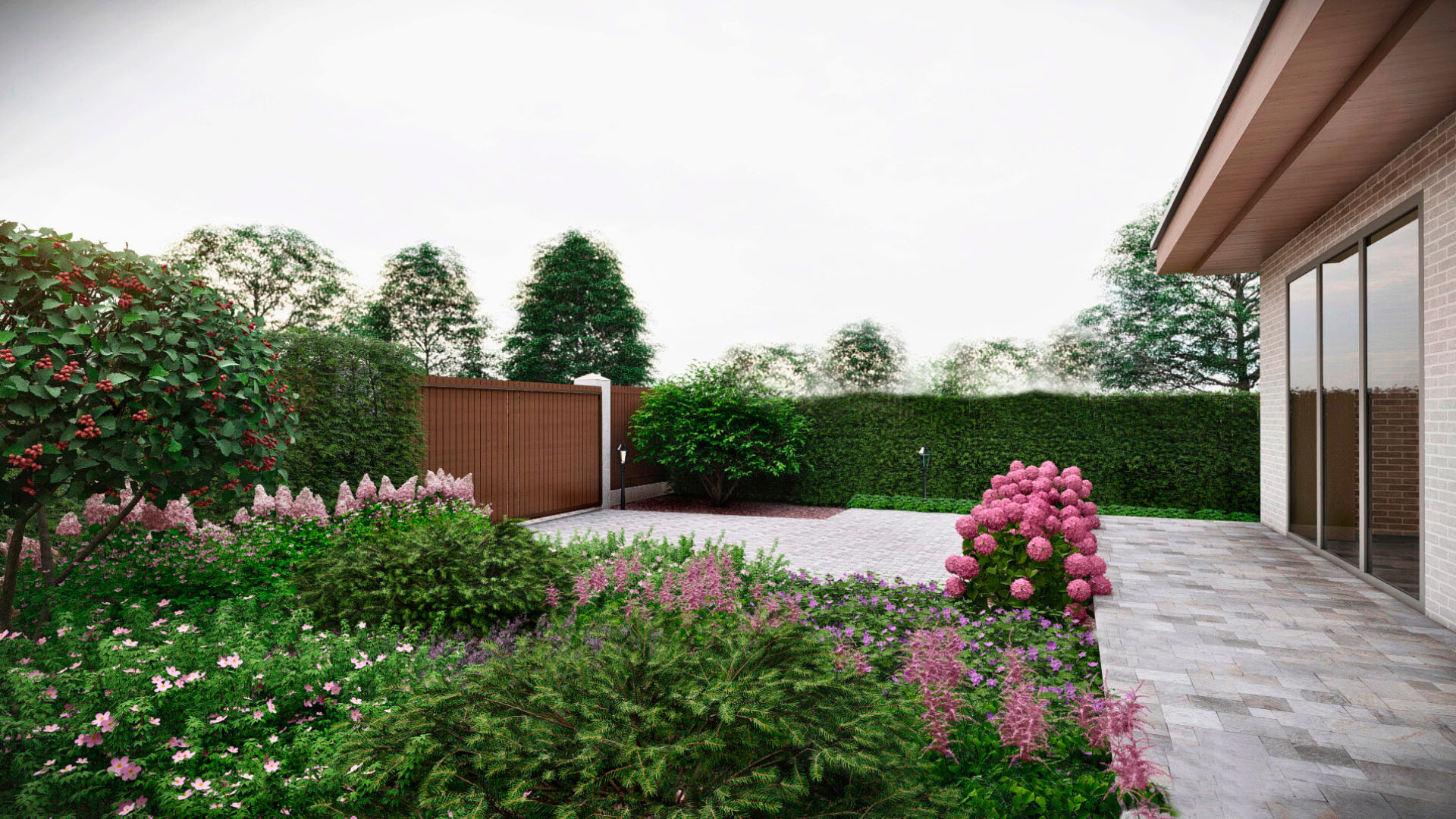 Заказчиком является частное лицо, и рабочий проект был выполнен в полном объеме. Поскольку участок преимущественно находится в тени, мы выбрали максимально теневыносливые растения, такие как астильбы, микробиоты, древовидные гортензии и пахисандра. На солнечных участках мы добавили гортензии для создания ярких акцентов.