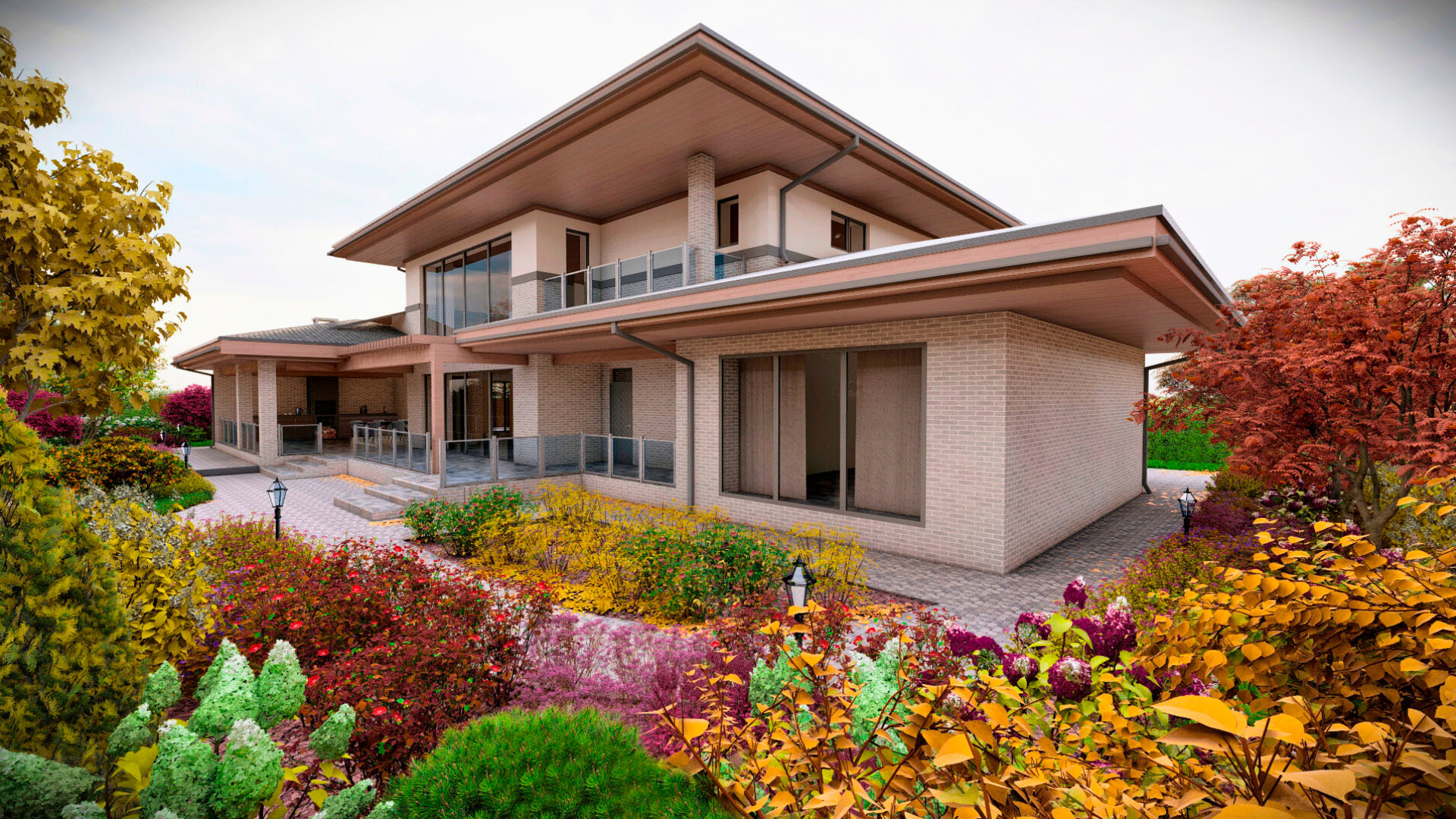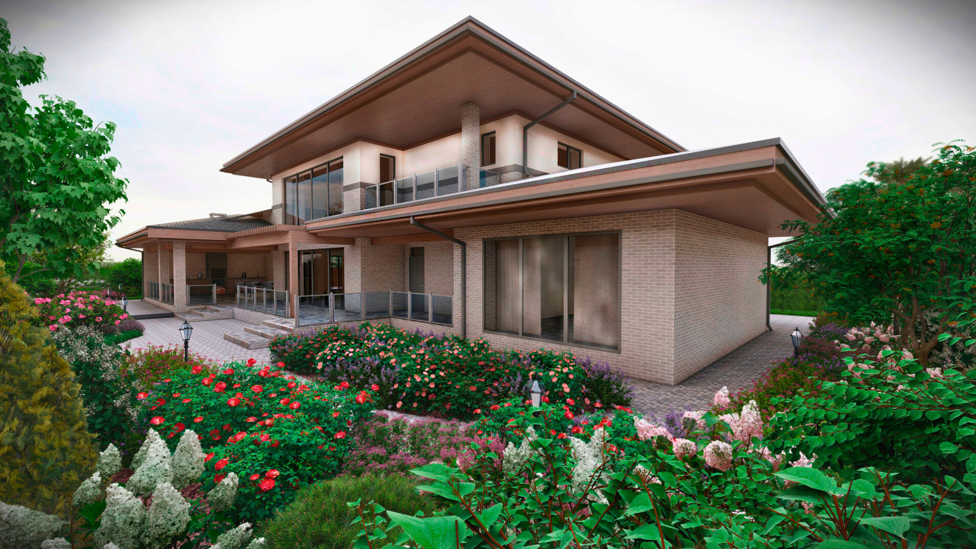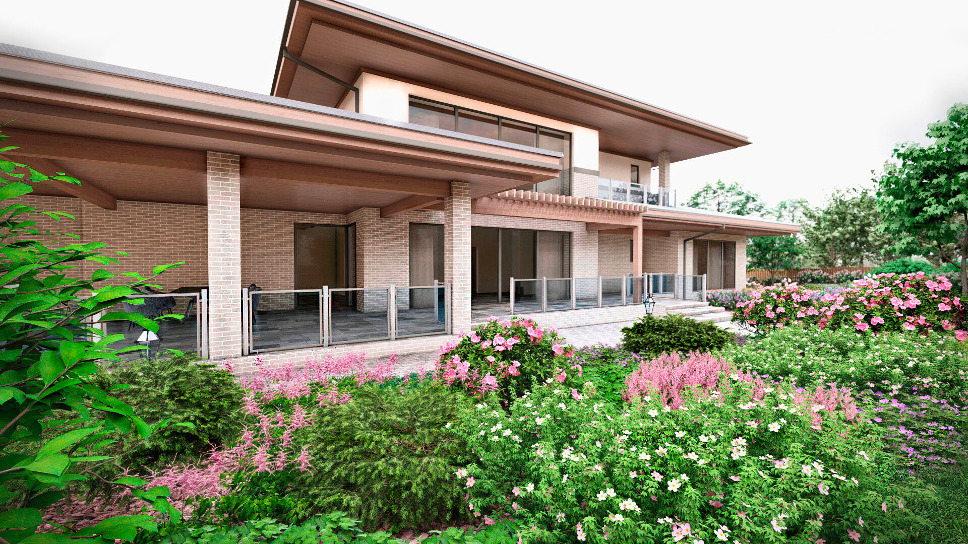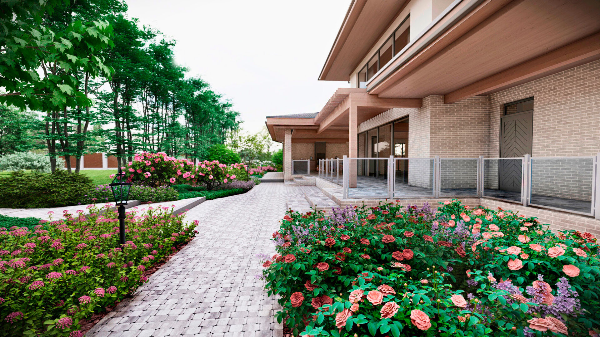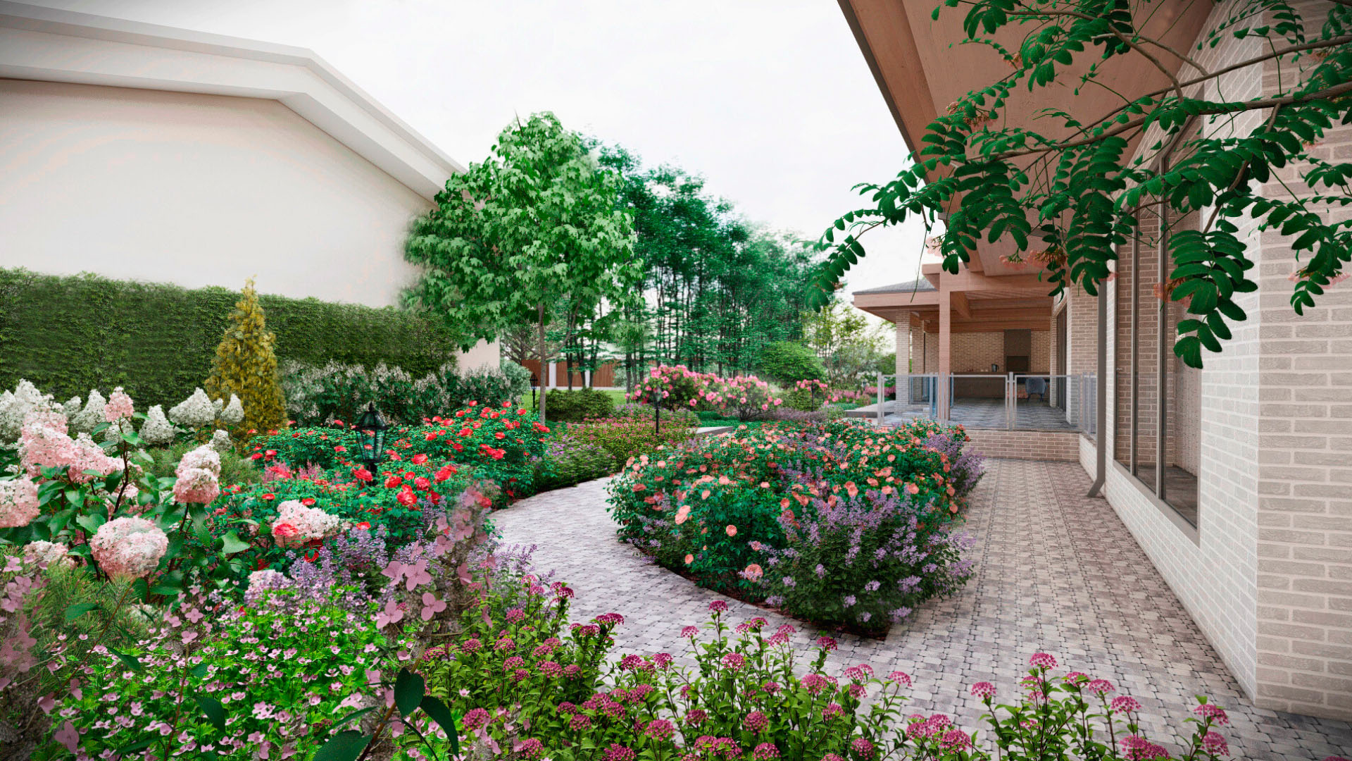 Заказчиком является частное лицо, и рабочий проект был выполнен в полном объеме. Поскольку участок преимущественно находится в тени, мы выбрали максимально теневыносливые растения, такие как астильбы, микробиоты, древовидные гортензии и пахисандра. На солнечных участках мы добавили гортензии для создания ярких акцентов.