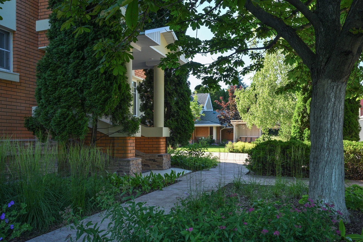 Мы разработали проект, начав с проектирования новой концепции дорожно-тропиночной сети и растительного дизайна. Мы сохранили в саду старые деревья: сосны, плодовые яблони, берёзы, клён и сербскую ель.