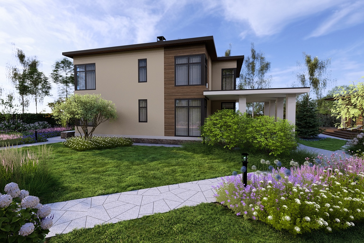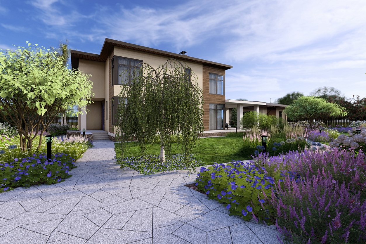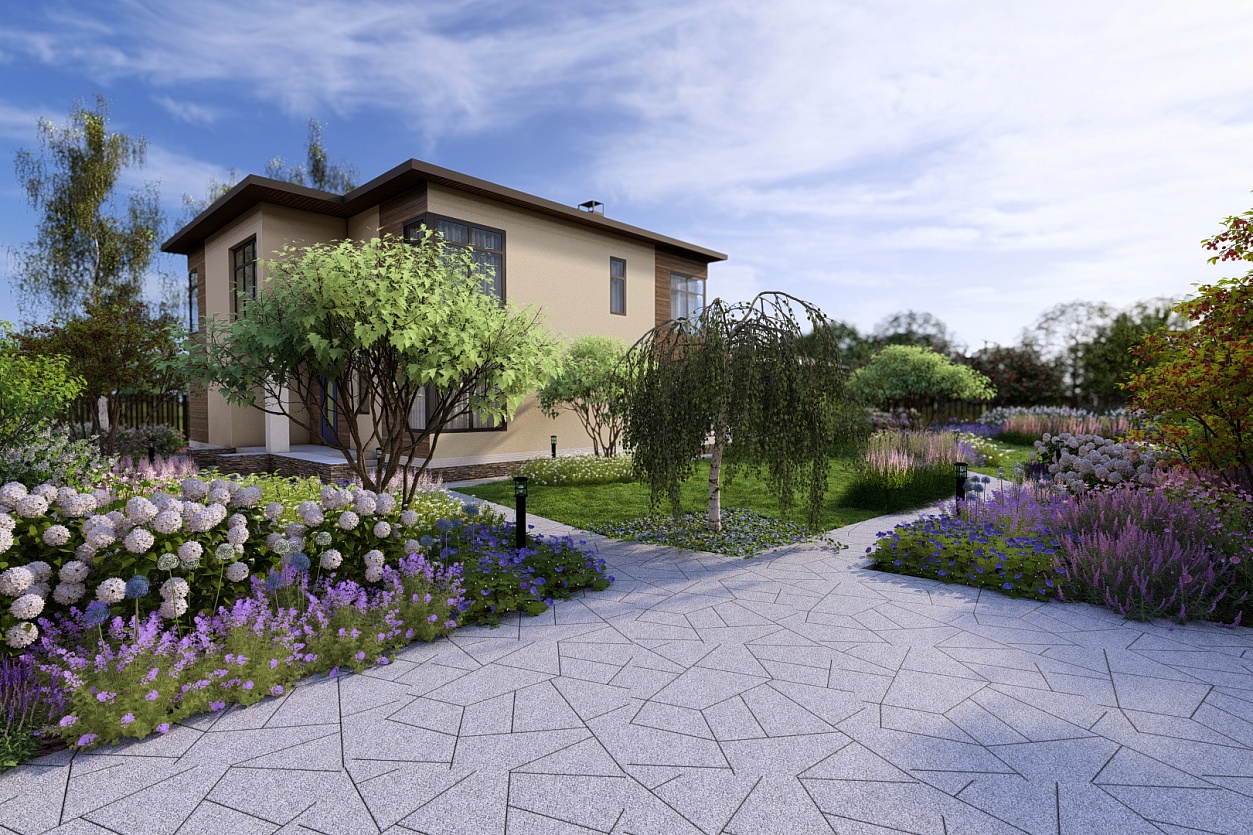 В основе планировочного решения — асимметричная геометрия, подчеркнутая мощением нестандартных форм. Растительный дизайн выстроен таким образом, чтобы добиться пышного цветения, но при этом сохранить легкость, воздушность и немного девичью утонченность.