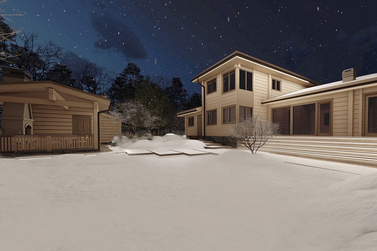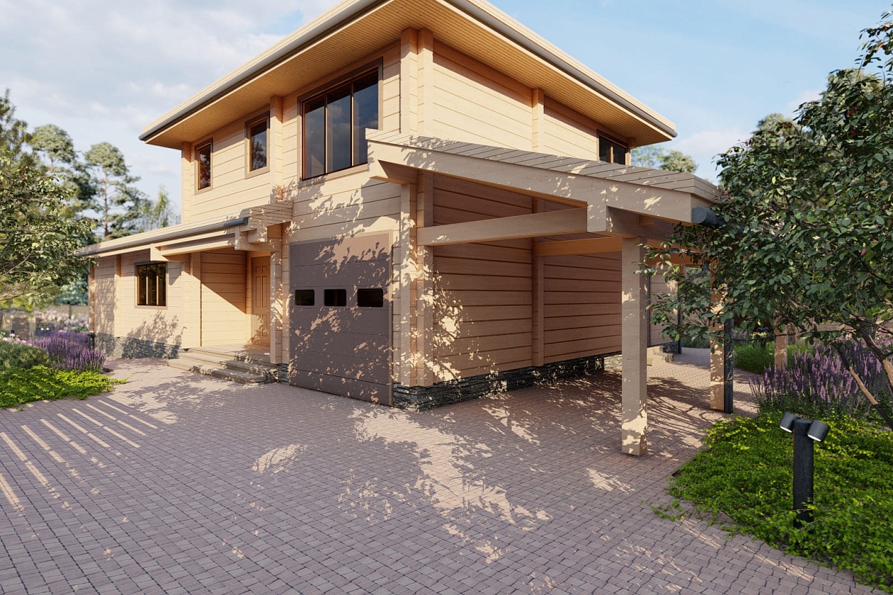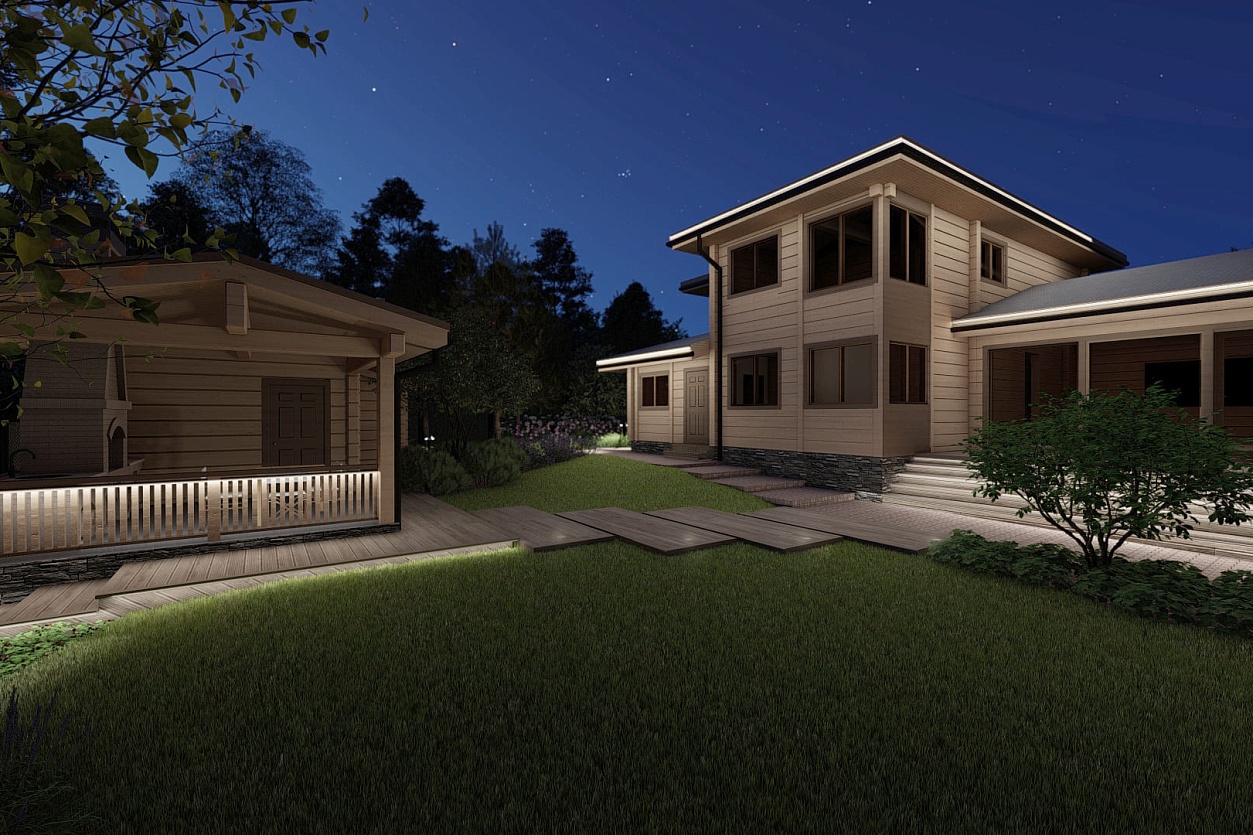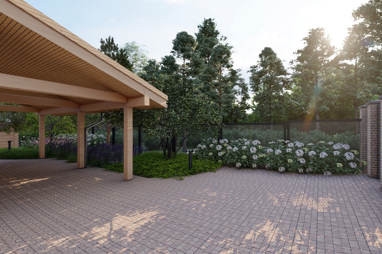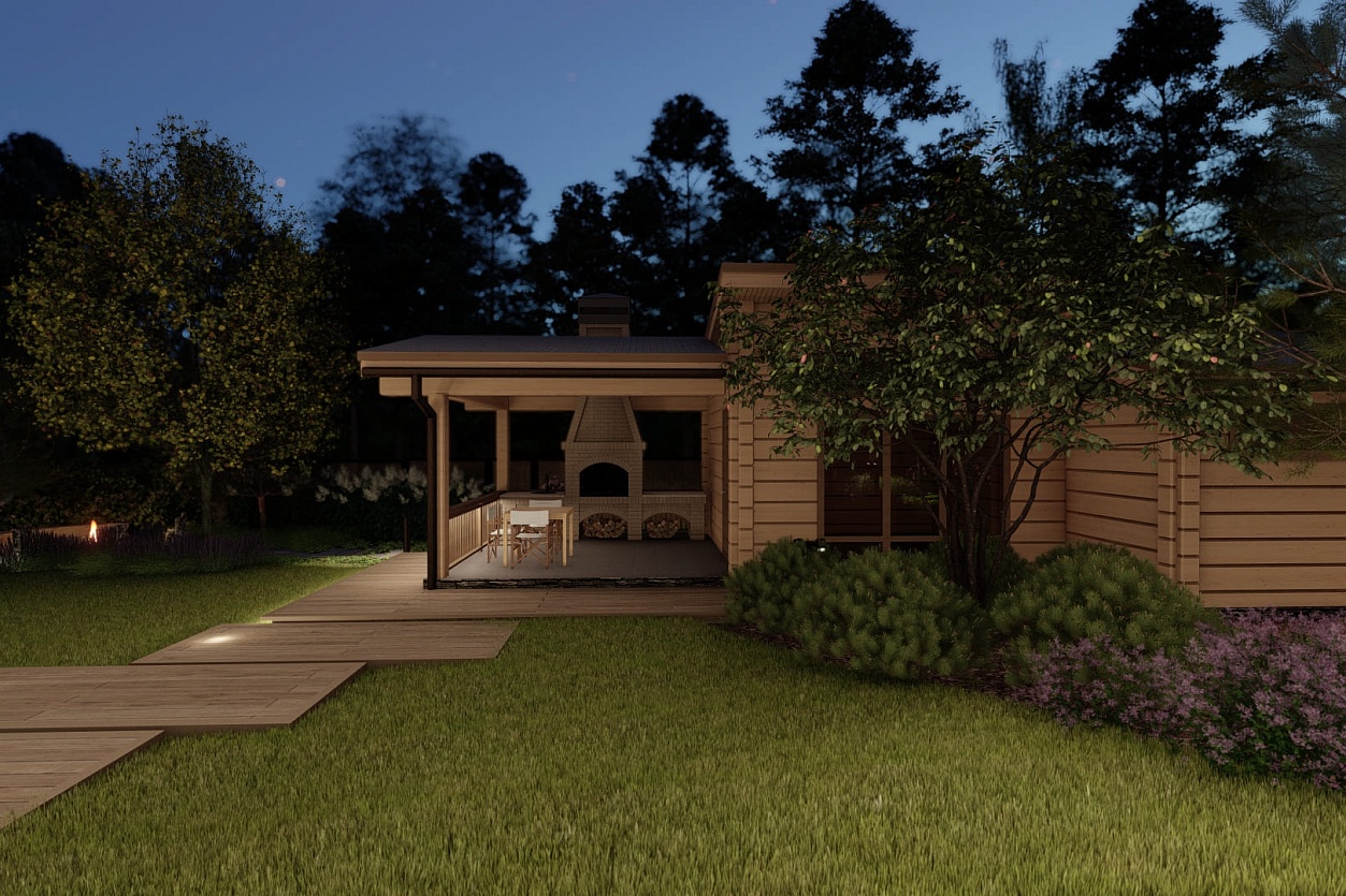 Название концепции — «Лесной Узор» — родилось естественно: участок примыкает к лесу, а хозяин увлекается резьбой по дереву и даже обустроил мастерскую прямо в доме.