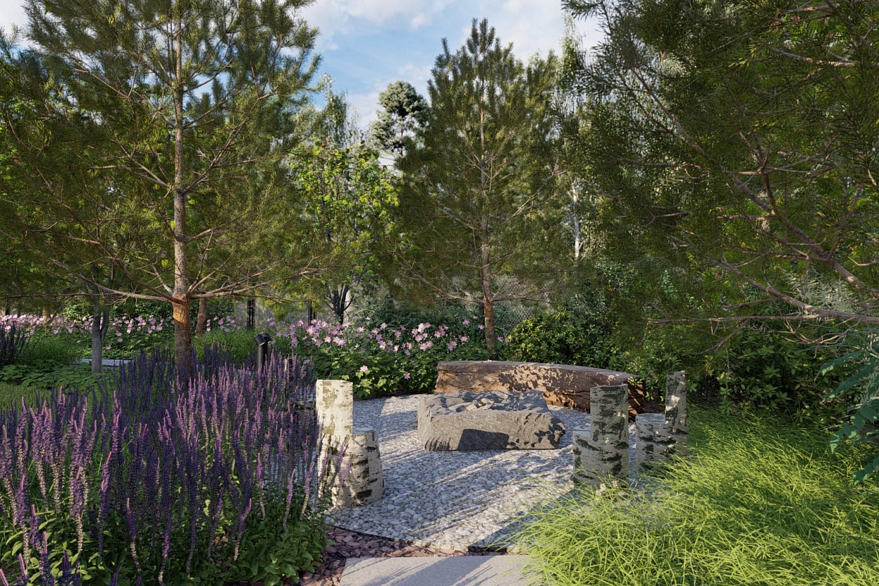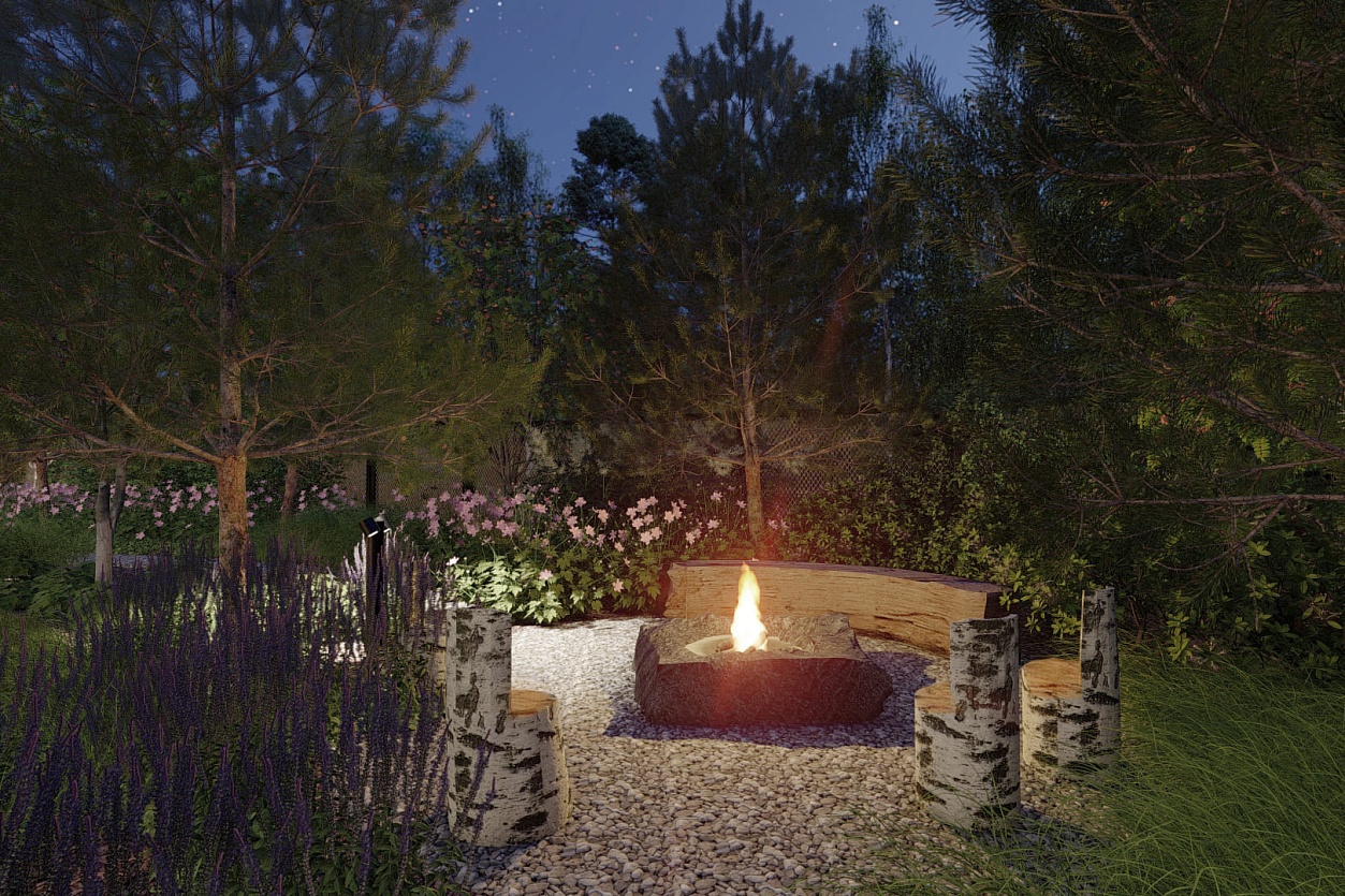 Зона очага скрыта от глаз: попасть туда можно только через зелёные посадки, что создаёт атмосферу уединённой лесной опушки.