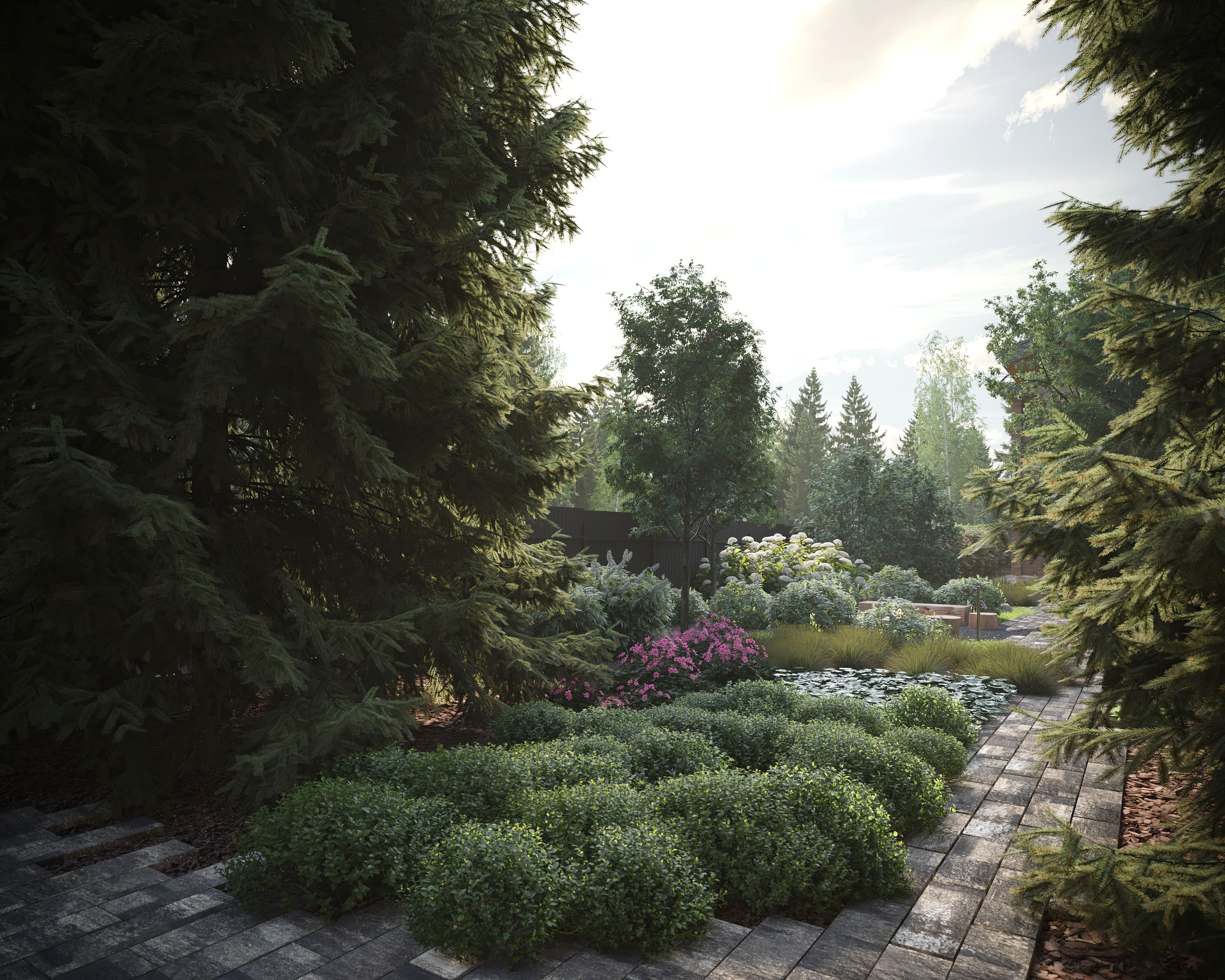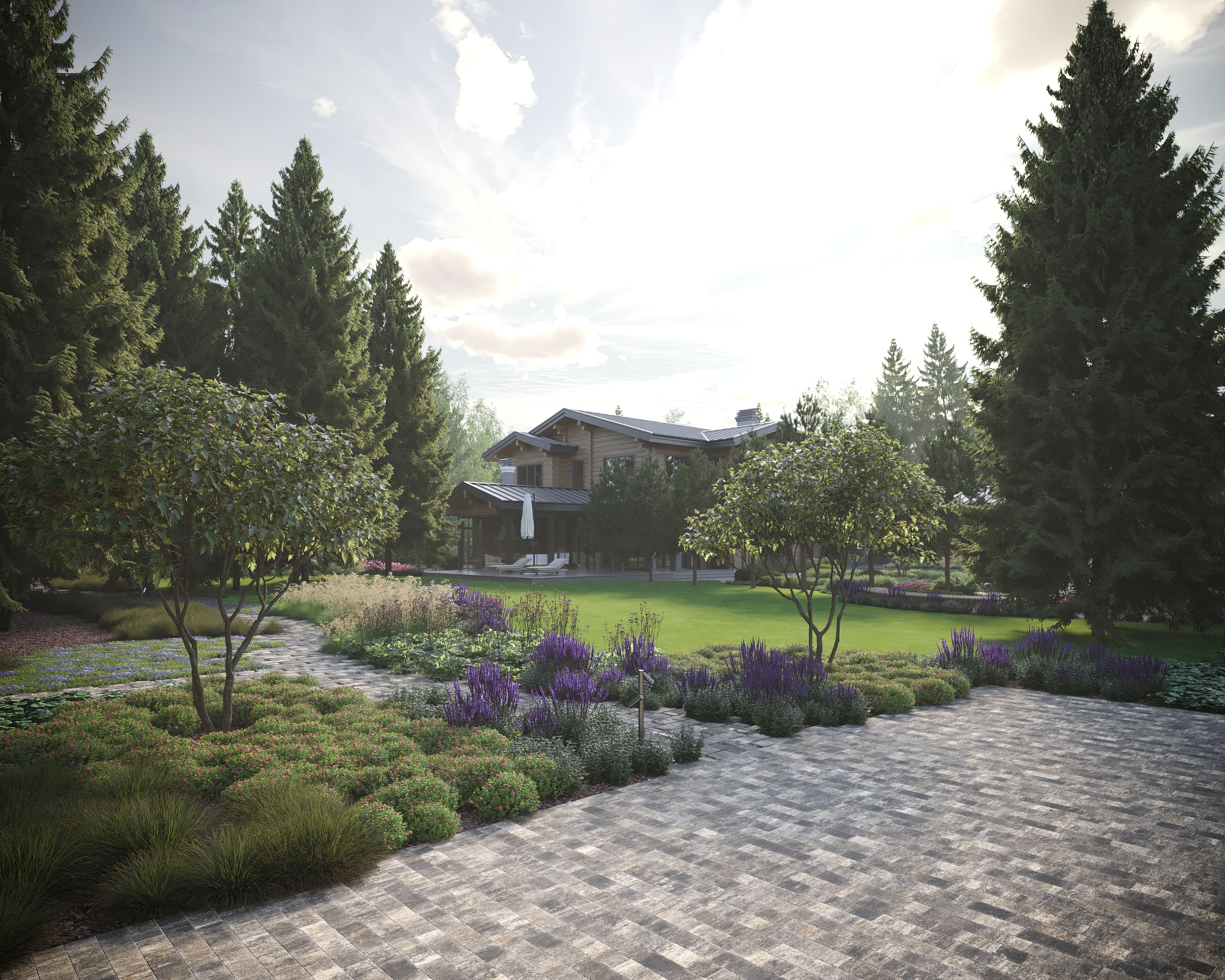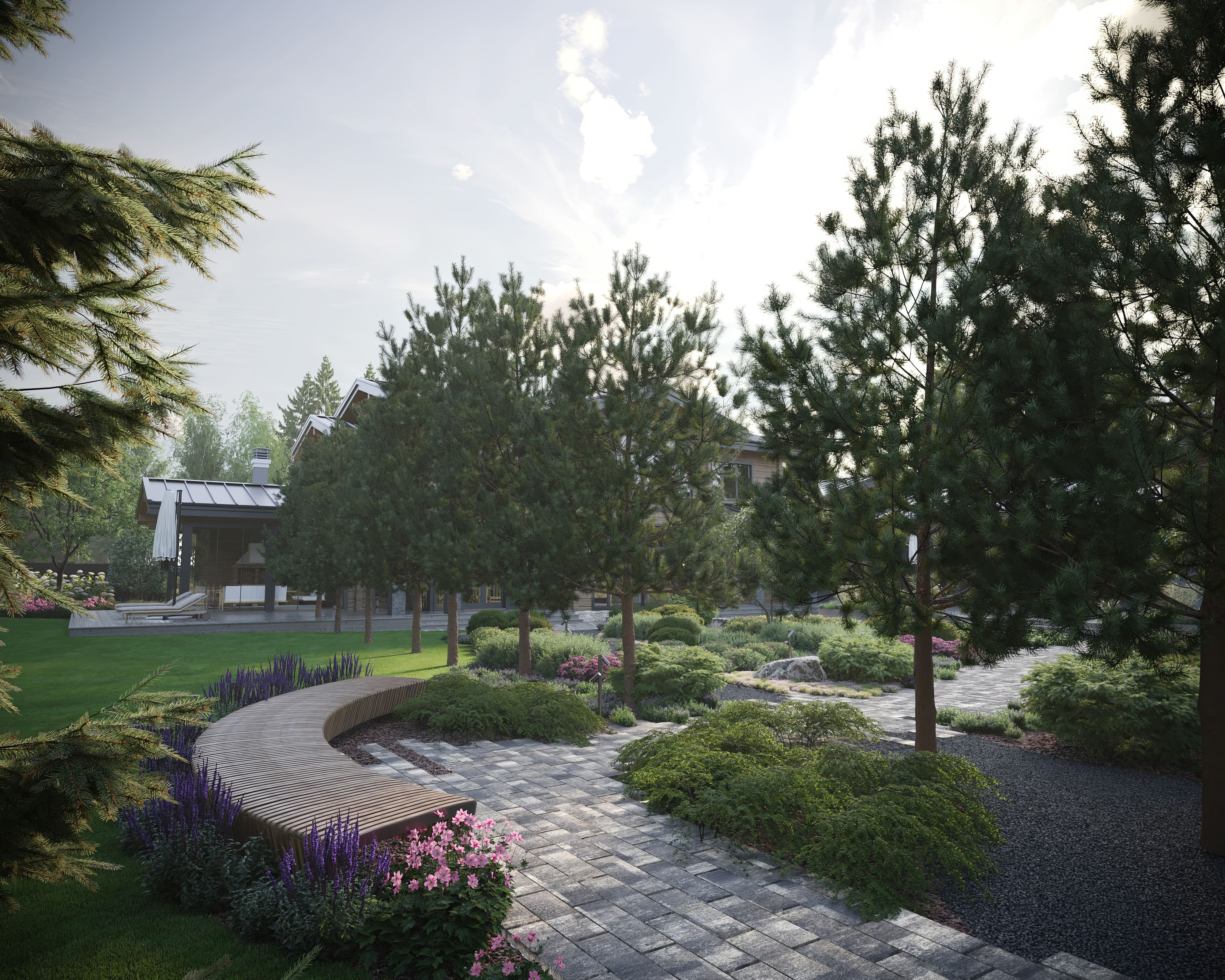 Главным вызовом стало проектирование ландшафта без повреждения корневой системы уже существующих деревьев — сохранить живое окружение и наполнить его современным ландшафтным содержанием.