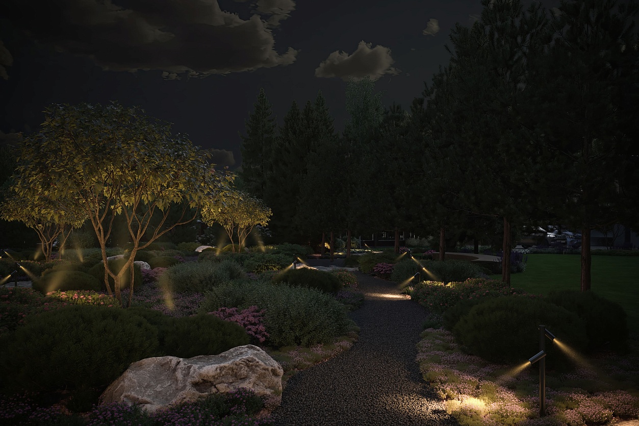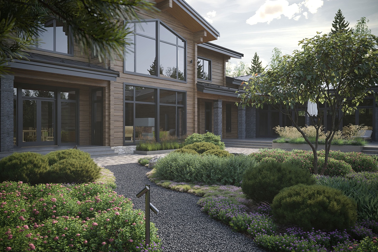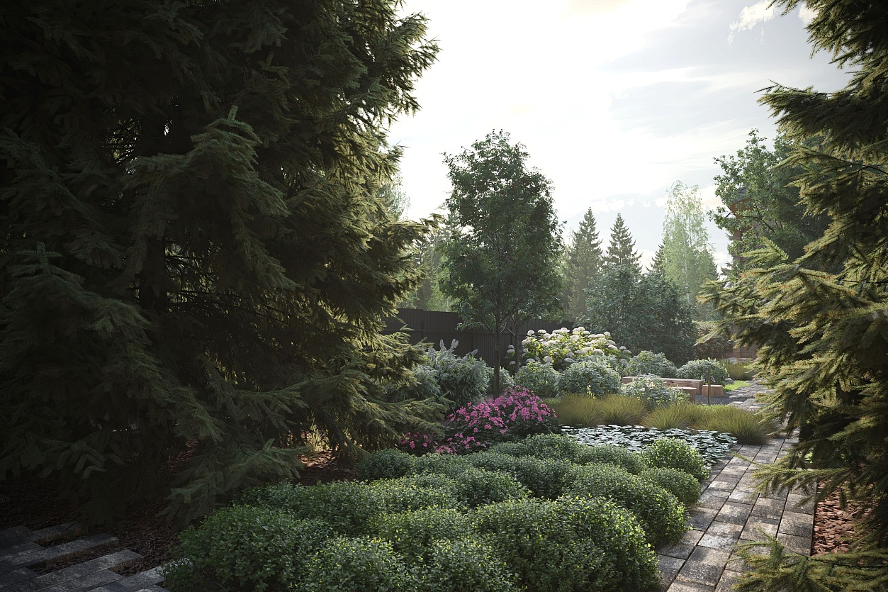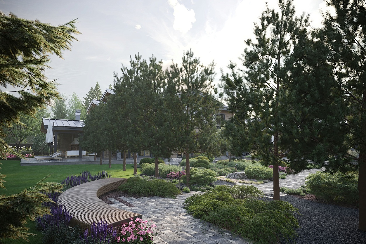 Главным вызовом стало проектирование ландшафта без повреждения корневой системы уже существующих деревьев — сохранить живое окружение и наполнить его современным ландшафтным содержанием.