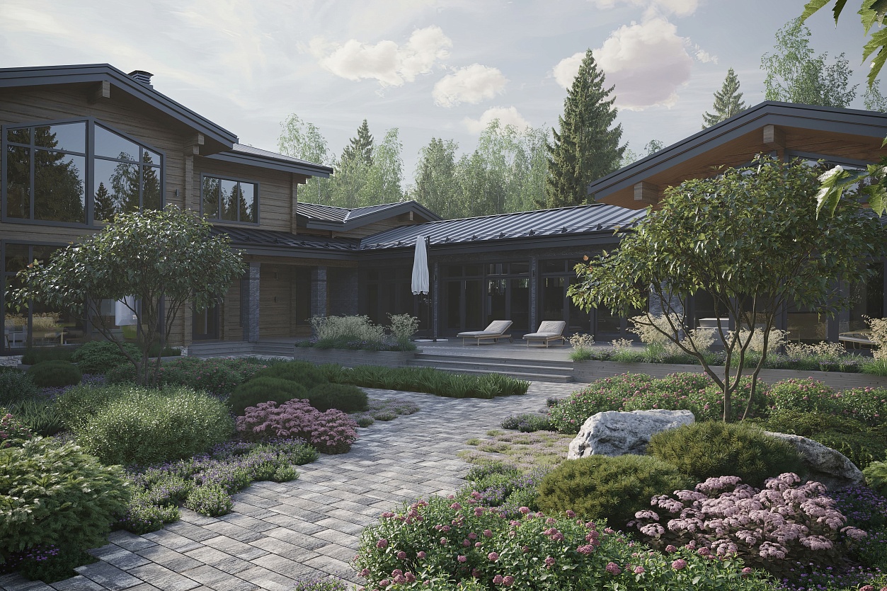 Проект на участке площадью 40 соток в Домодедовском городском округе Московской области. На территории располагается большой жилой дом с зоной отдыха, спортивным залом и бассейном, что повлекло за собой проектирование просторной внутренней террасы — она размещена во дворе, образуемом строениями в форме буквы «Г», включая гостевой дом и гараж.