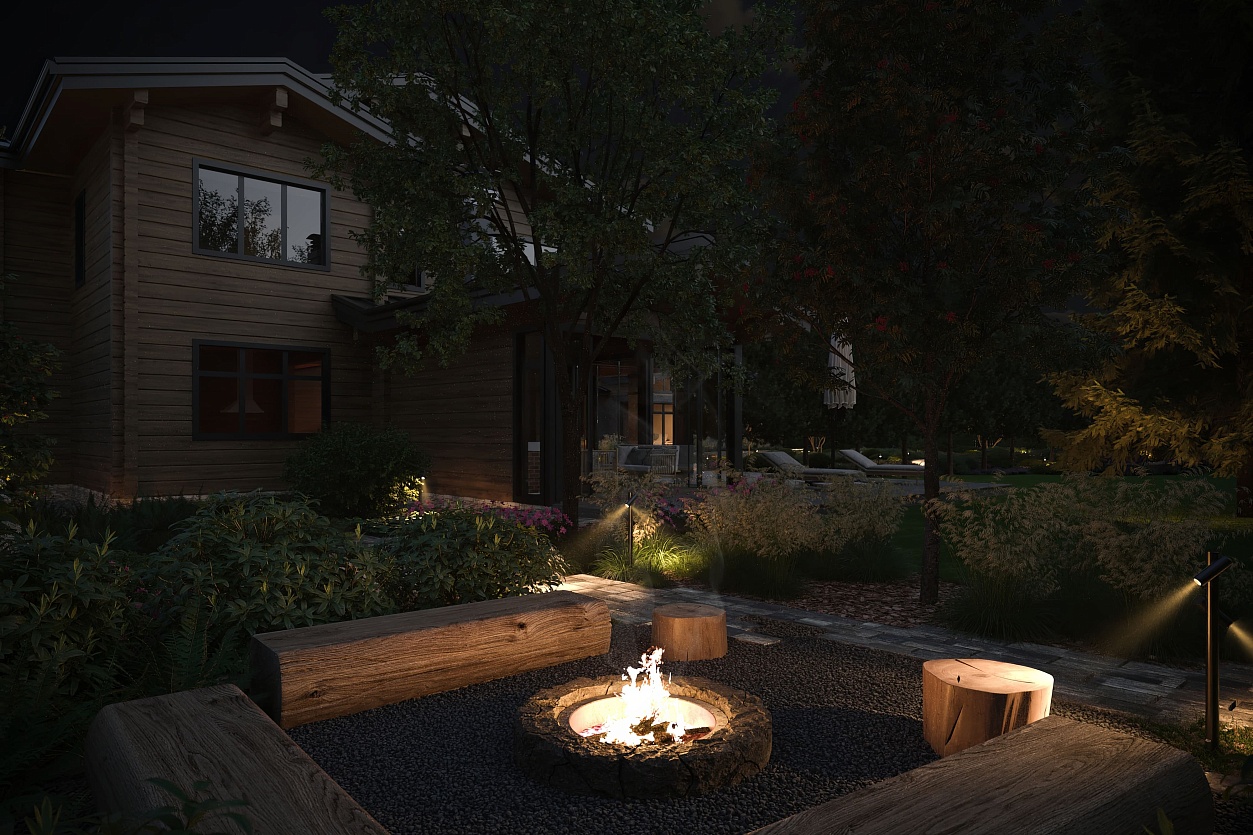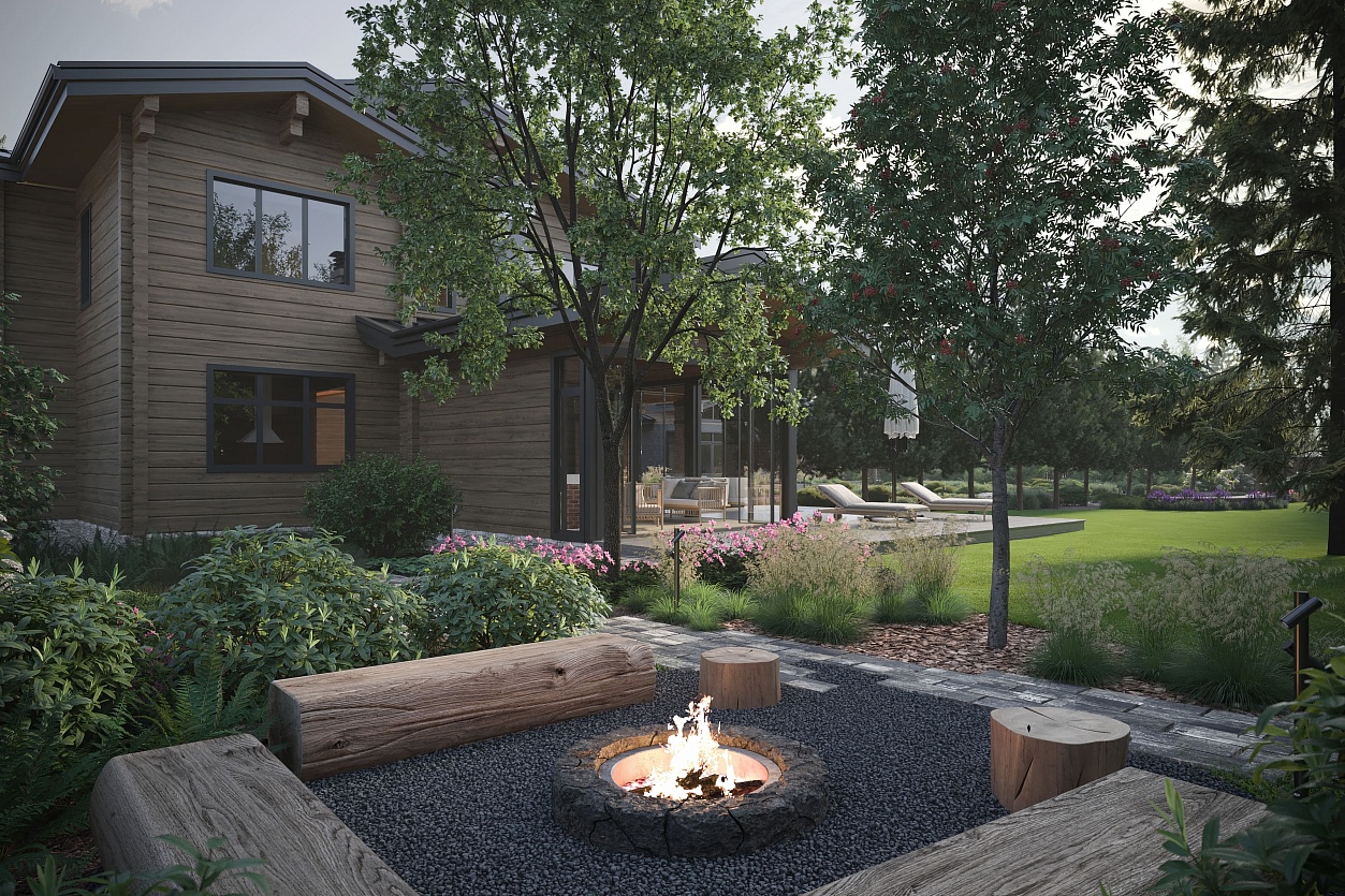 Основная задача заключалась в создании современного, уютного пространства, органично вписанного в природную среду. Мы стремились сохранить каждое дерево, спроектировать зону очага, сохранить опушку, а также создать террасу у гостевого дома и реализовать выход в лес.