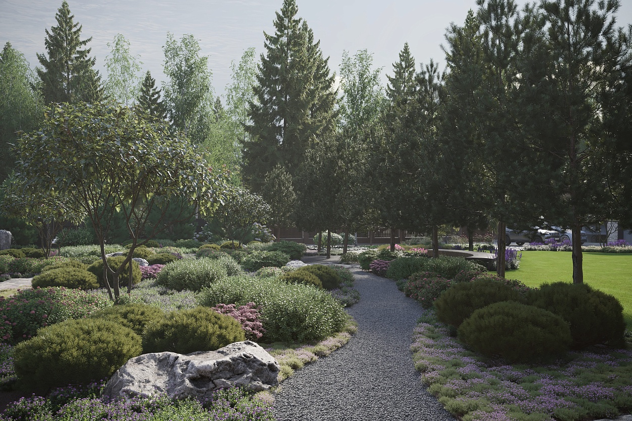 В солнечных местах — ели нидиформис, поддерживающие композиционно взрослые ели; сосны горные, спиреи японские, стефанандра, мышанка и другие почвопокровные.
