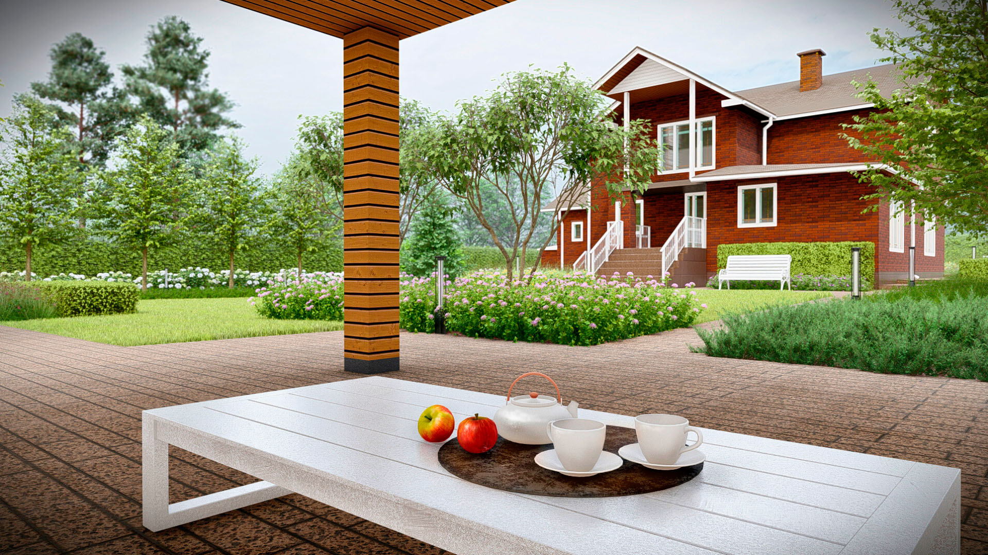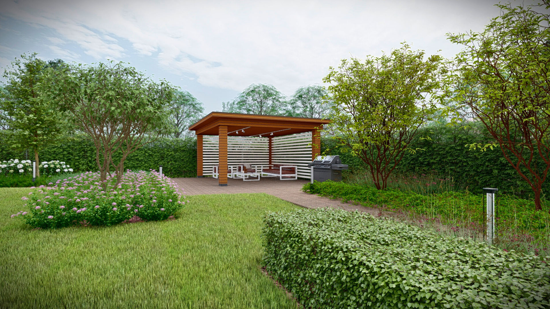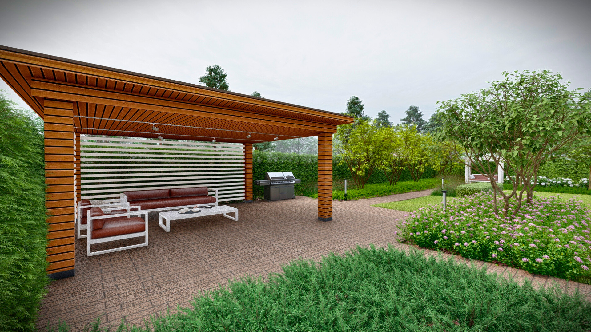 • Зона патио — идеальное место для отдыха с барбекю и скамеечками, создающее уютную атмосферу для встреч с друзьями и семьей.
