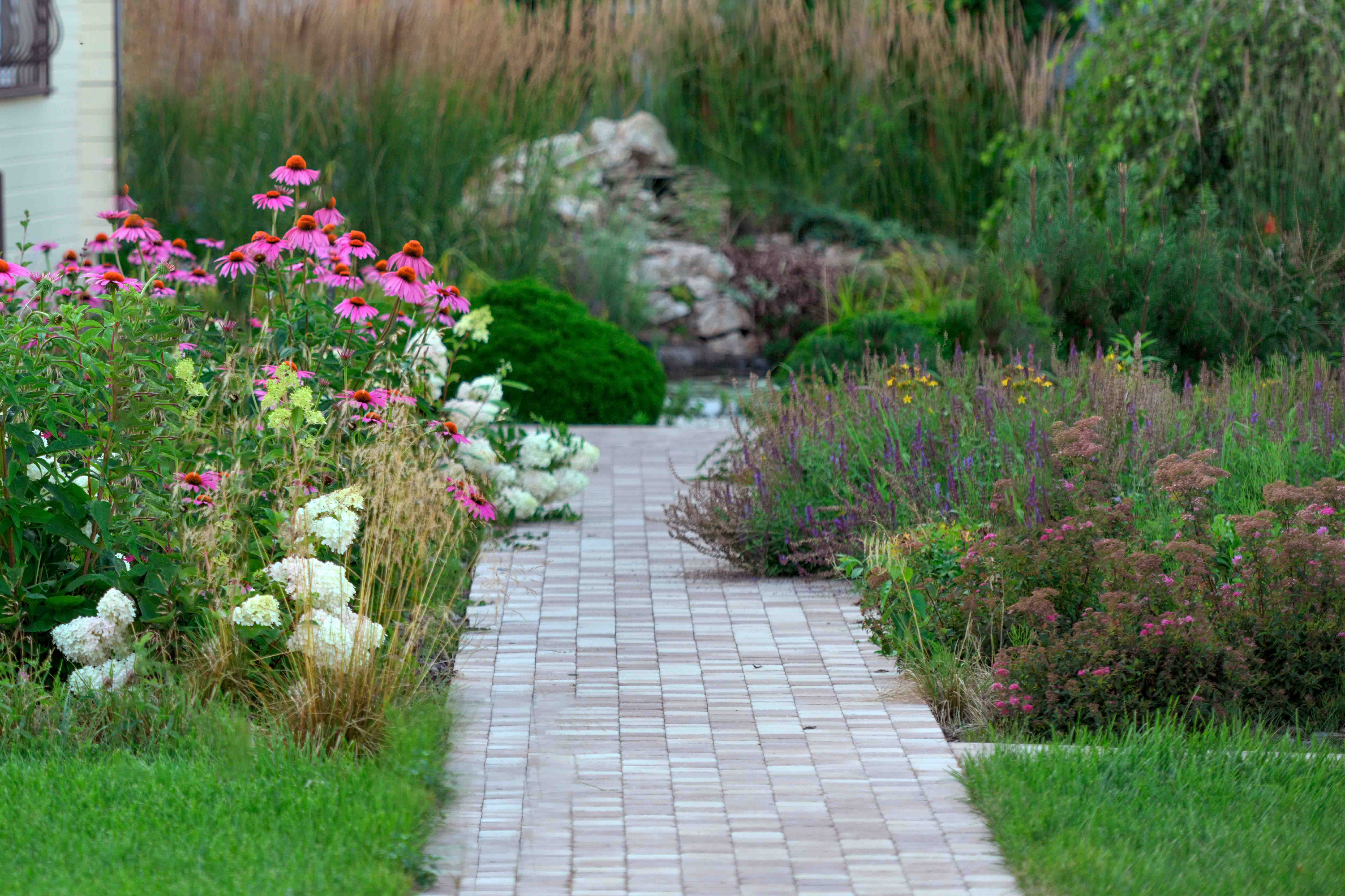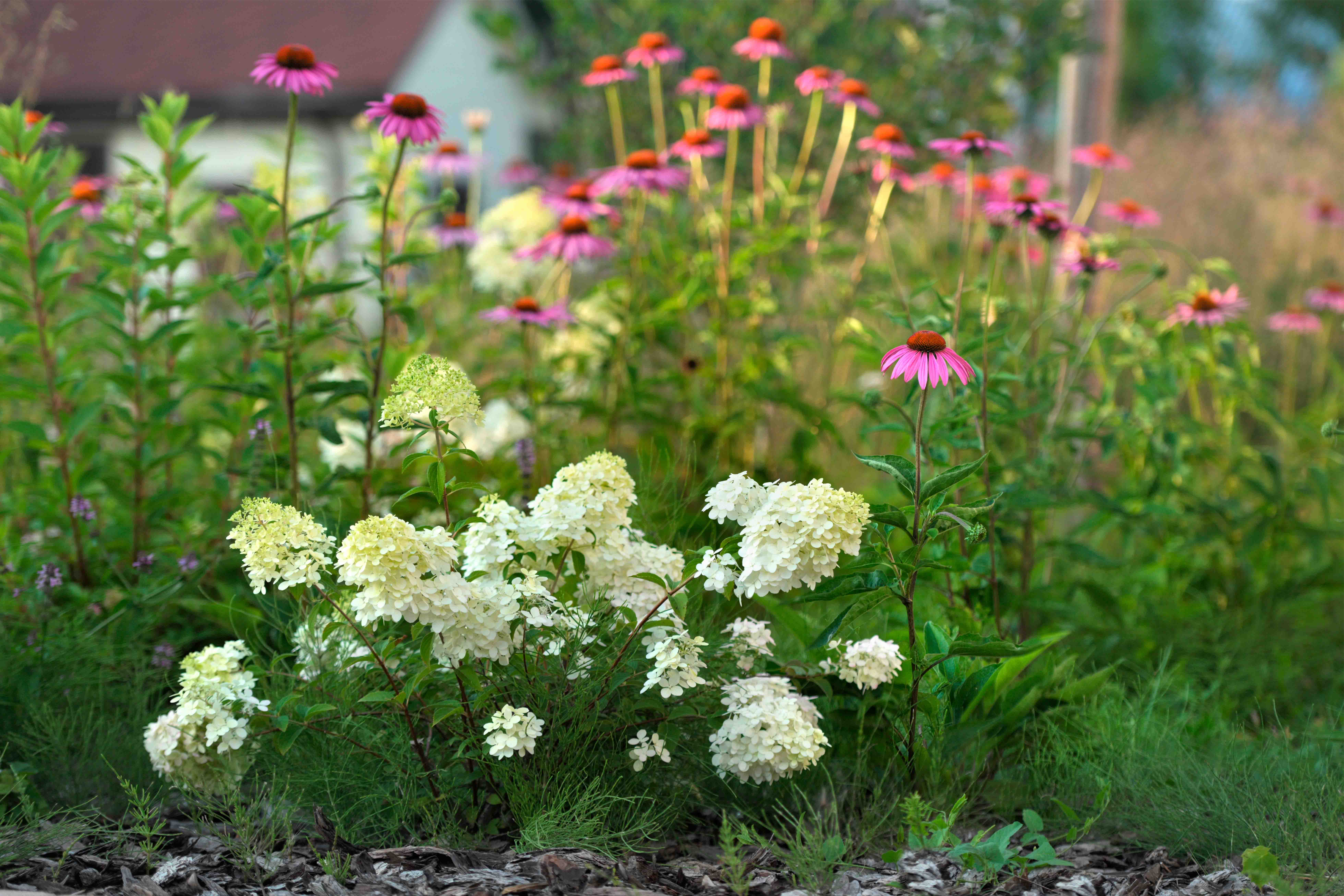 В саду использованы гортензии, злаковые культуры — щучка, молиния, веянник, а также многолетники: кровохлёбка, шалфей, эхинацея, пионы и герань «Розанна».