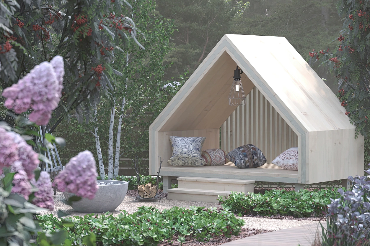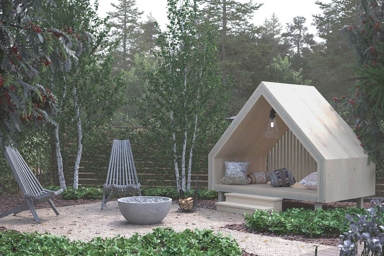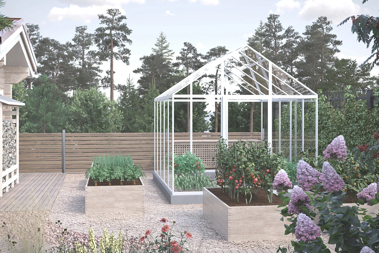 По просьбе старшего поколения заказчиков предусмотрена огородная зона — аккуратная, функциональная, но при этом оформленная так, чтобы вписываться в общую эстетику сада. Также в проект включена зона очага, созданная для вечерних посиделок, тёплых бесед и созерцательных пауз. В передней части участка располагается большая парковка с навесом, что решает практическую сторону жизни семьи, не перегружая пространство.