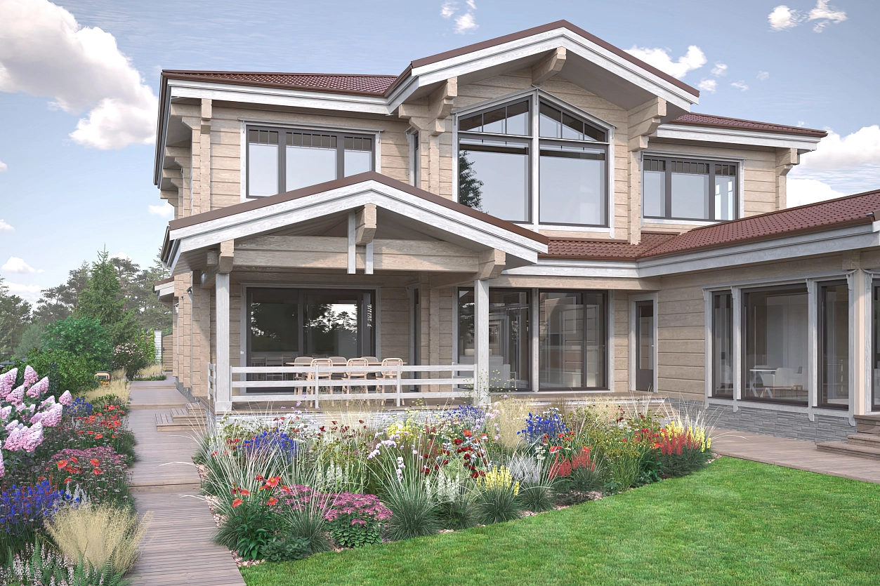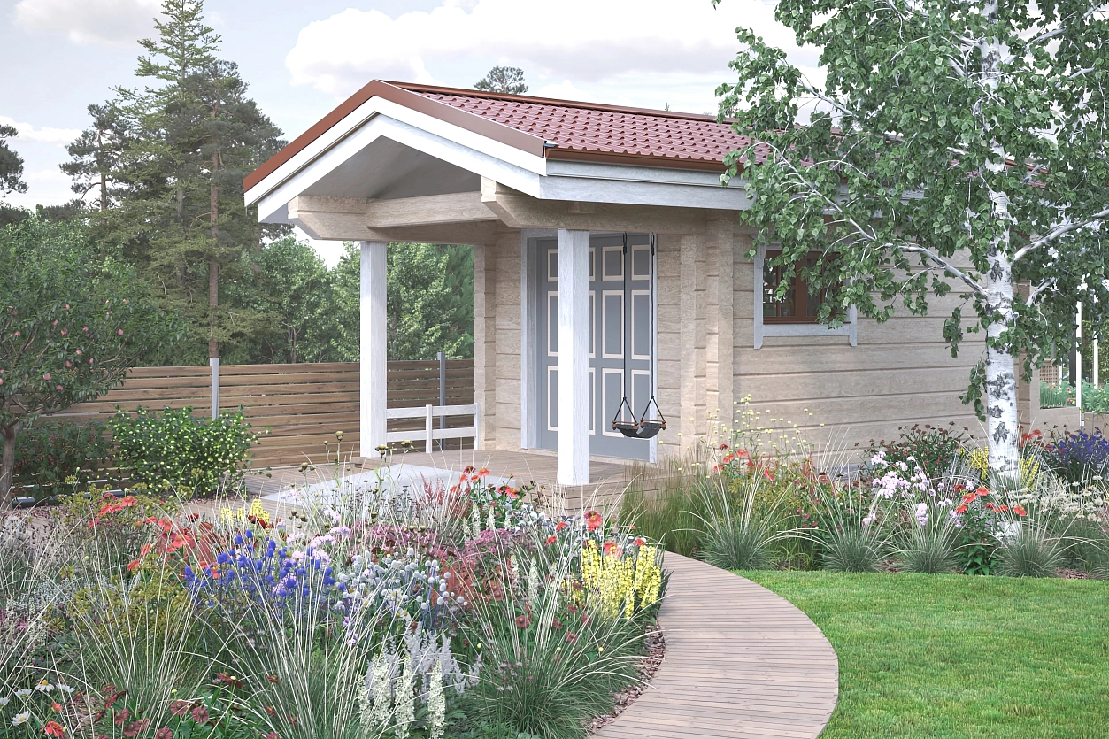 Рабочий проект выполнен в стандартной структуре, однако имеет крайне выразительную особенность: все дорожки и парковочные зоны запланированы из лиственницы. Такое решение делает пространство теплее, уютнее и буквально роднит его с природой, позволяя саду звучать мягко и органично в любое время года.