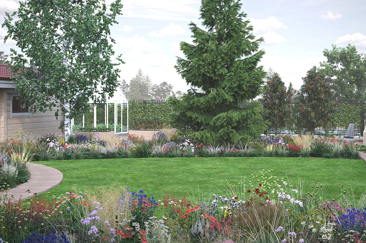 В основу растительной композиции легла овсяница мэера — пластичная, структурная, создающая динамику в посадках. Её густые голубоватые кочки привносят ритм, формируют живые линии и прекрасно подчёркивают идею современного русского сада. Мы сохранили на участке шикарные ели и берёзы, которые стали естественными акцентами и опорными точками всей планировки.