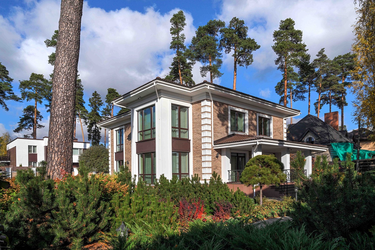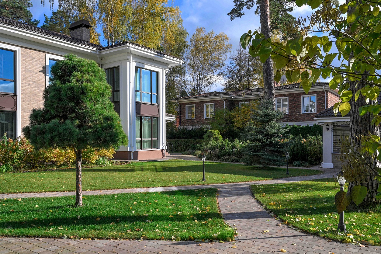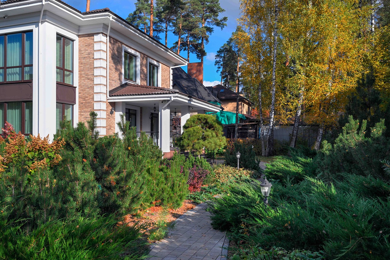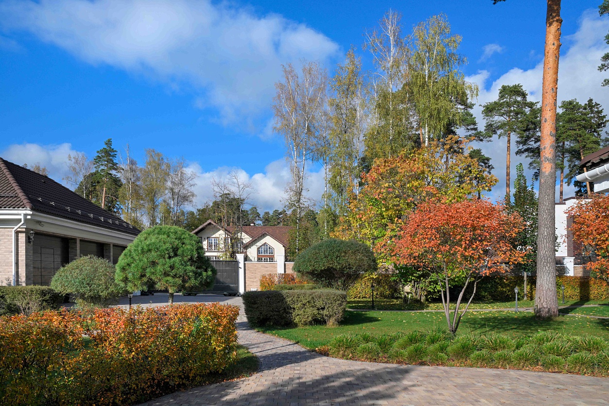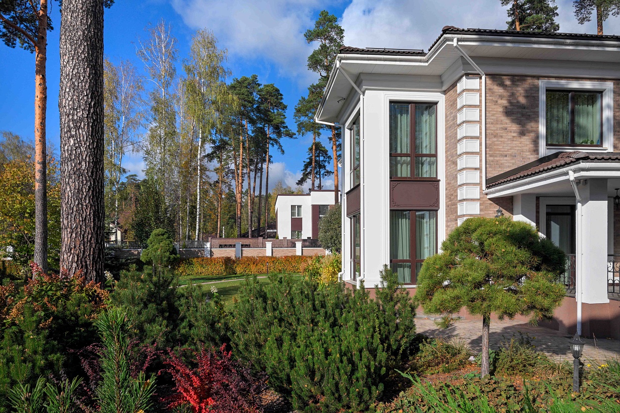 Мы начали проектирование с учетом его запросов на создание сдержанного, зеленого сада с минимальным уходом. На тот момент большой красивый дом находился на стадии строительства, а участок уже украшали несколько взрослых сосен. Мы также проектировали беседку, гараж, дорожки и систему автополива. Клиент изначально не хотел обширных газонов, но в процессе обсуждения он все же выбрал классический вариант.