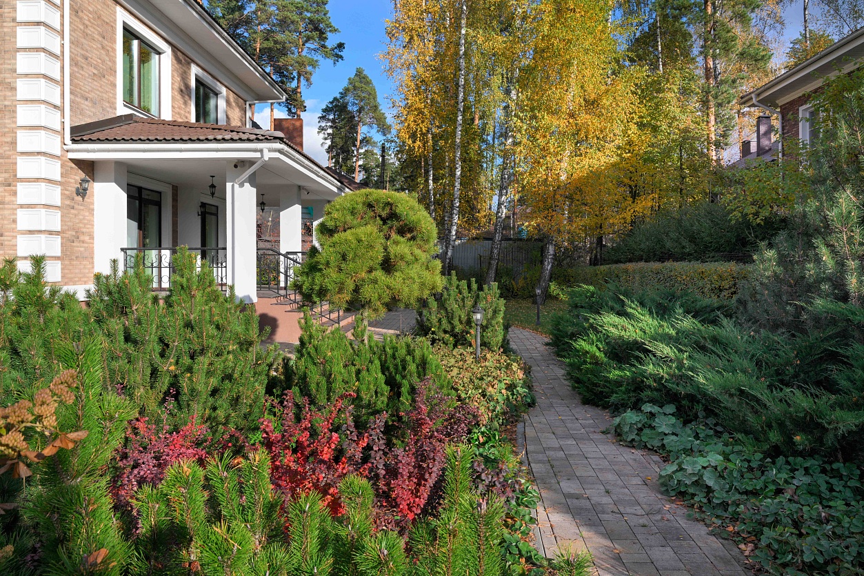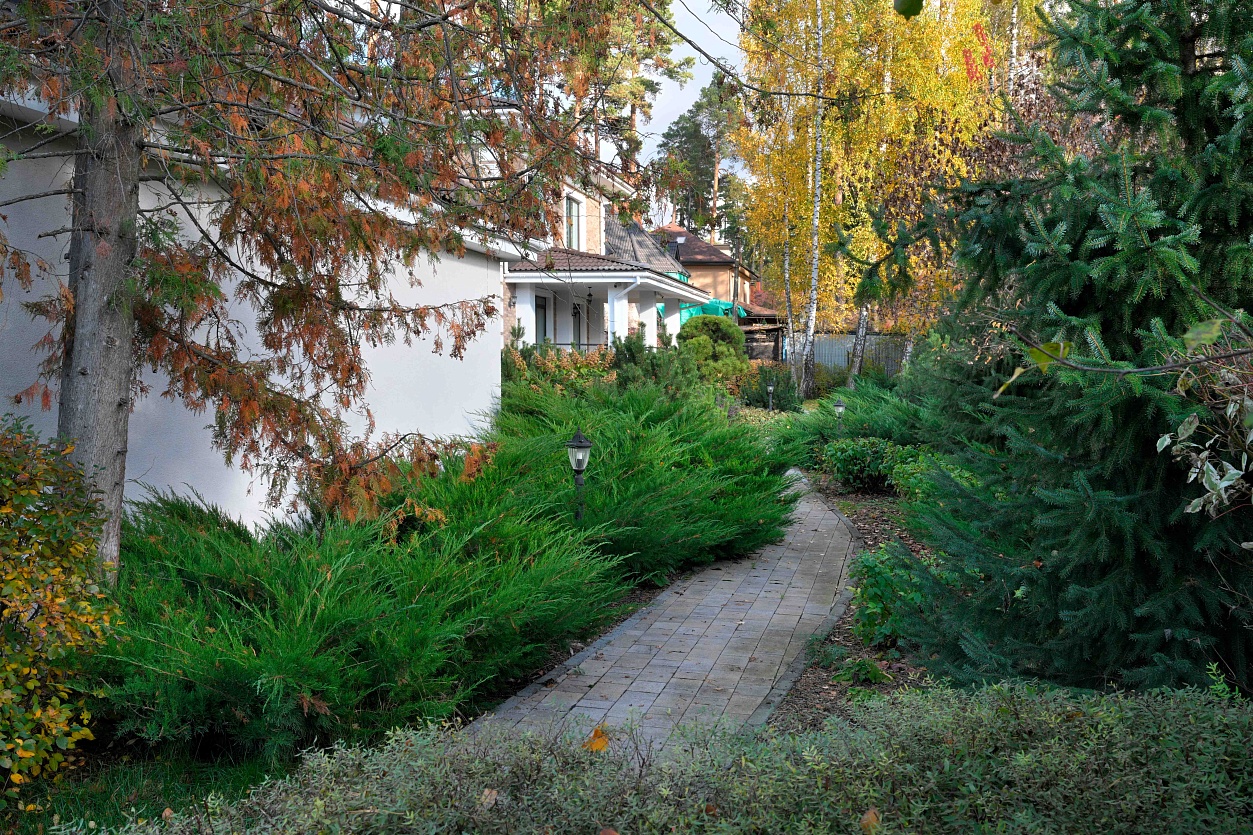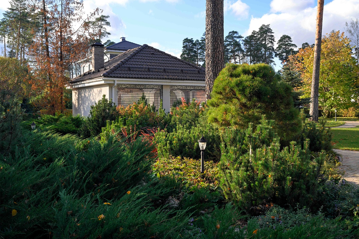 Проект включал создание сдержанного зелёного сада с минимальными требованиями к уходу. На участке уже росли взрослые сосны, а мы дополнили пространство беседкой, гаражом, дорожками и системой автополива. Изначальным пожеланием заказчика были большие площади газона. Но в процессе обсуждения, нам удалось убедить собственника в необходимости наполнения участка объемами из деревьев, кустарников и многолетников